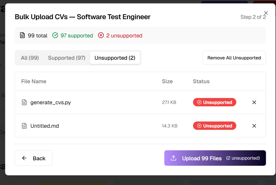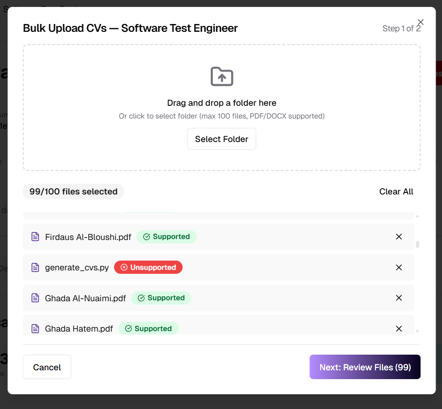 The Bulk CV Upload feature has been significantly enhanced with a higher file limit, a two-step review workflow, and improved file validation. Recruiters can now upload up to 100 CV files at once with clear visibility into which files are supported before processing begins.