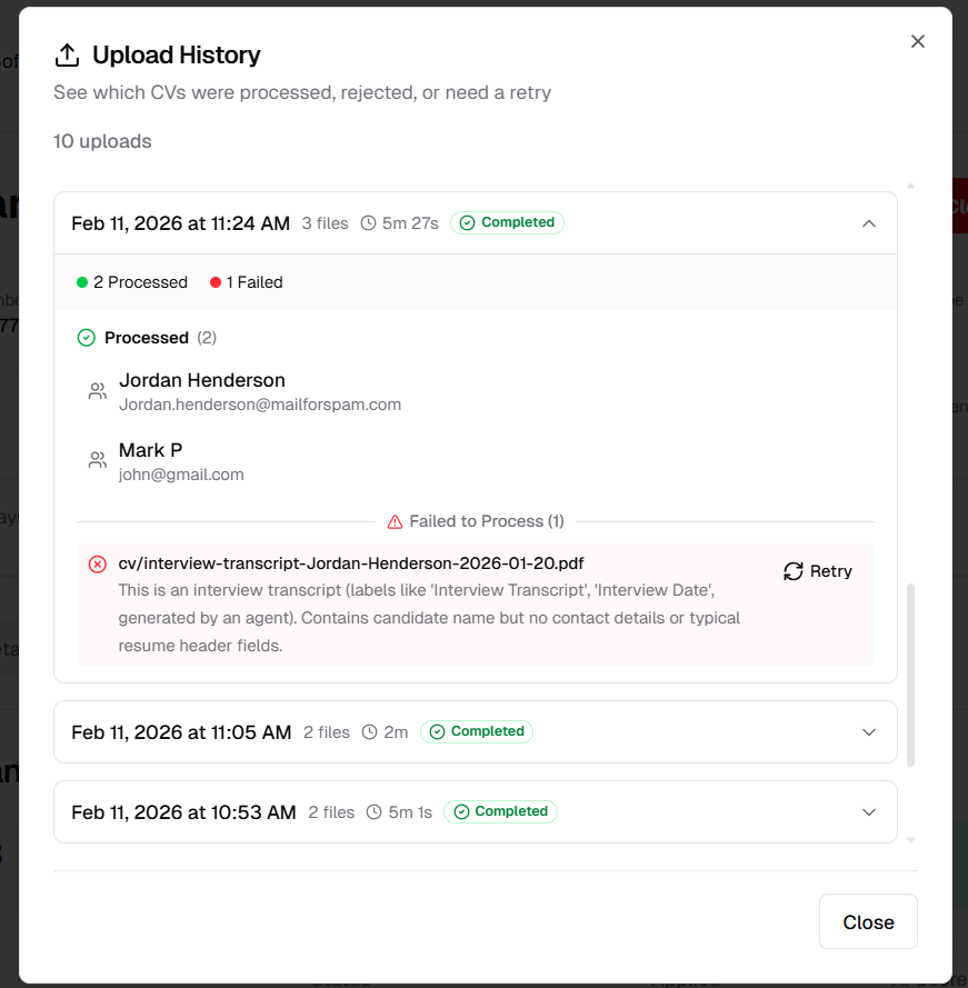 The new Upload History panel provides a complete audit trail of all past bulk upload sessions. Recruiters can review which CVs were processed, which failed, and retry individual failed files without re-uploading the entire batch.