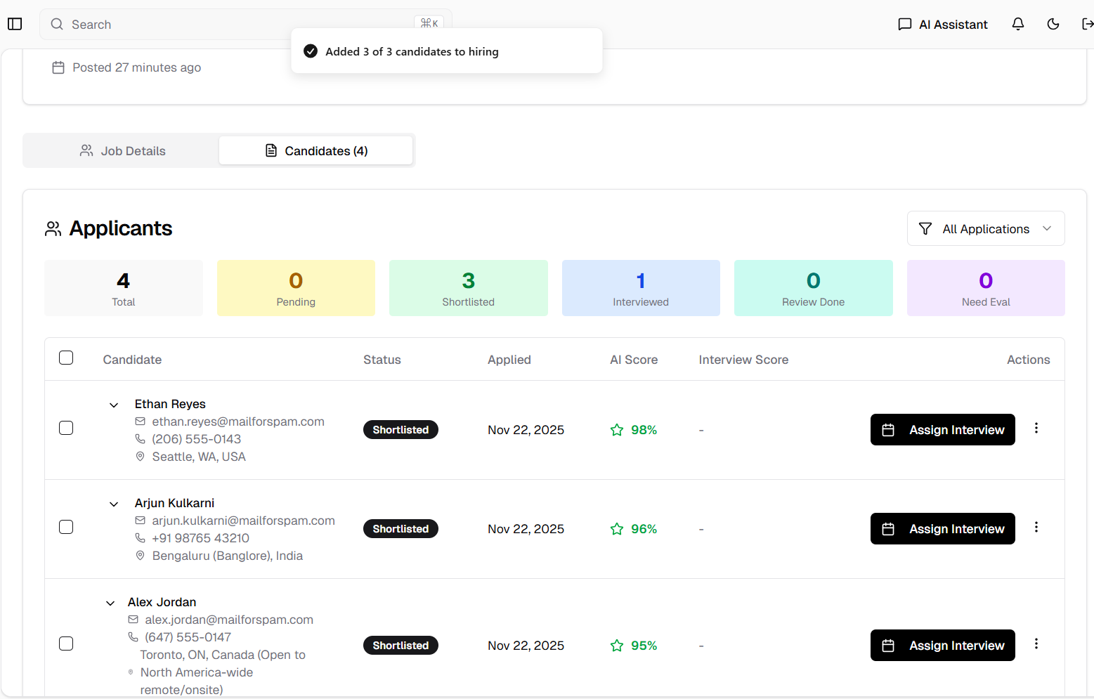 3. Shortlisted candidates show "Assign Interview" button