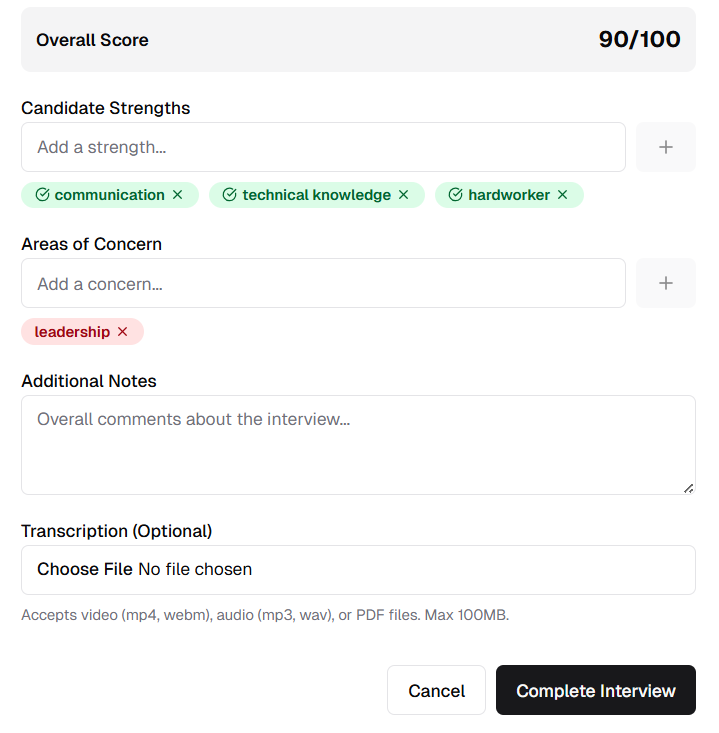 This release introduces a comprehensive manual interview module for complete control over your interview process. You can schedule interviews with customizable settings, send calendar invitations to candidates and interviewers, and complete interviews with detailed evaluation scoring.